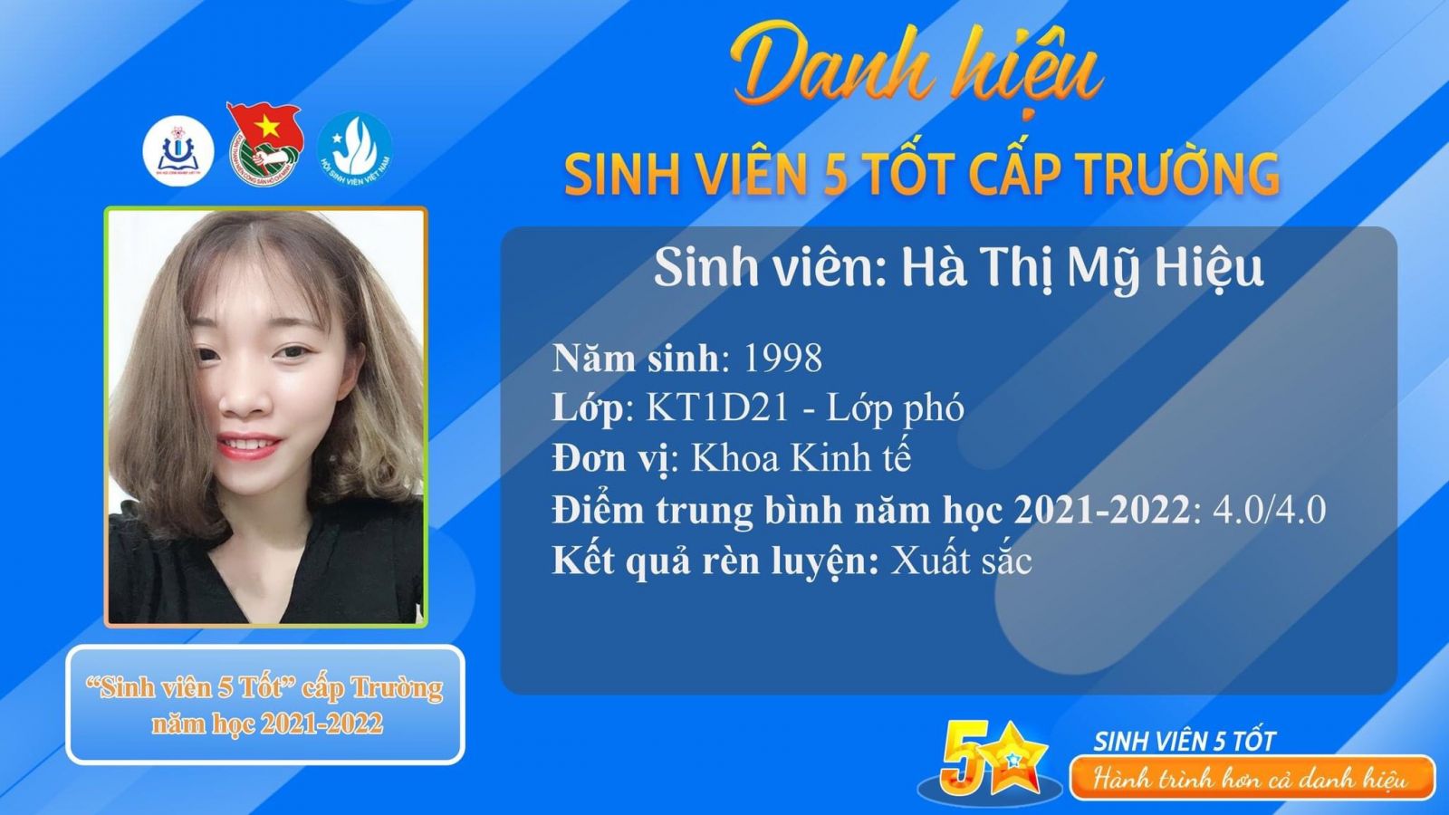 Hiệu mới là sinh viên năm thứ 2 nhưng em sở hữu một thành tích học tập “Khủng” đạt thang điểm 4.0/4.0 là sinh viên xuất sắc 3 kỳ liên tiếp. Ngoài học tập xuất sắc, Hiệu còn là một cây thể thao, cây văn nghệ “đáng nể” của lớp, khoa. Em là thành viên của đội bóng chuyền của Nhà trường tham dự giải bóng chuyền hơi học sinh, sinh viên lần thứ Nhất 2023 và đạt giải nhất; Giải nhì bóng chuyền khoa Kinh tế năm 2022. Mỹ Hiệu tham gia hội thi Văn nghệ quần chúng chào mừng 20/11 năm 2022 em đạt giải nhì đơn ca và giải nhất bình chọn trên fanpage. Không những học tập tốt, có năng khiếu văn nghệ, thể thao, Hà Mỹ Hiệu còn là một thanh niên tình nguyện nhiệt tình em tham gia Hiến máu nhân đạo, các hoạt động tình nguyện của Khoa và Nhà trường. Với những thành tích của mình, Hiệu đã vinh dự được nhận học bổng loại xuất sắc, danh hiệu “ Sinh viên 5 tốt” cấp trường năm 2022; Giấy khen có thành tích xuất sắc trong phong trào đoàn, hội năm 2022; Danh hiệu “Tình nguyện viên năng động” năm 2022…