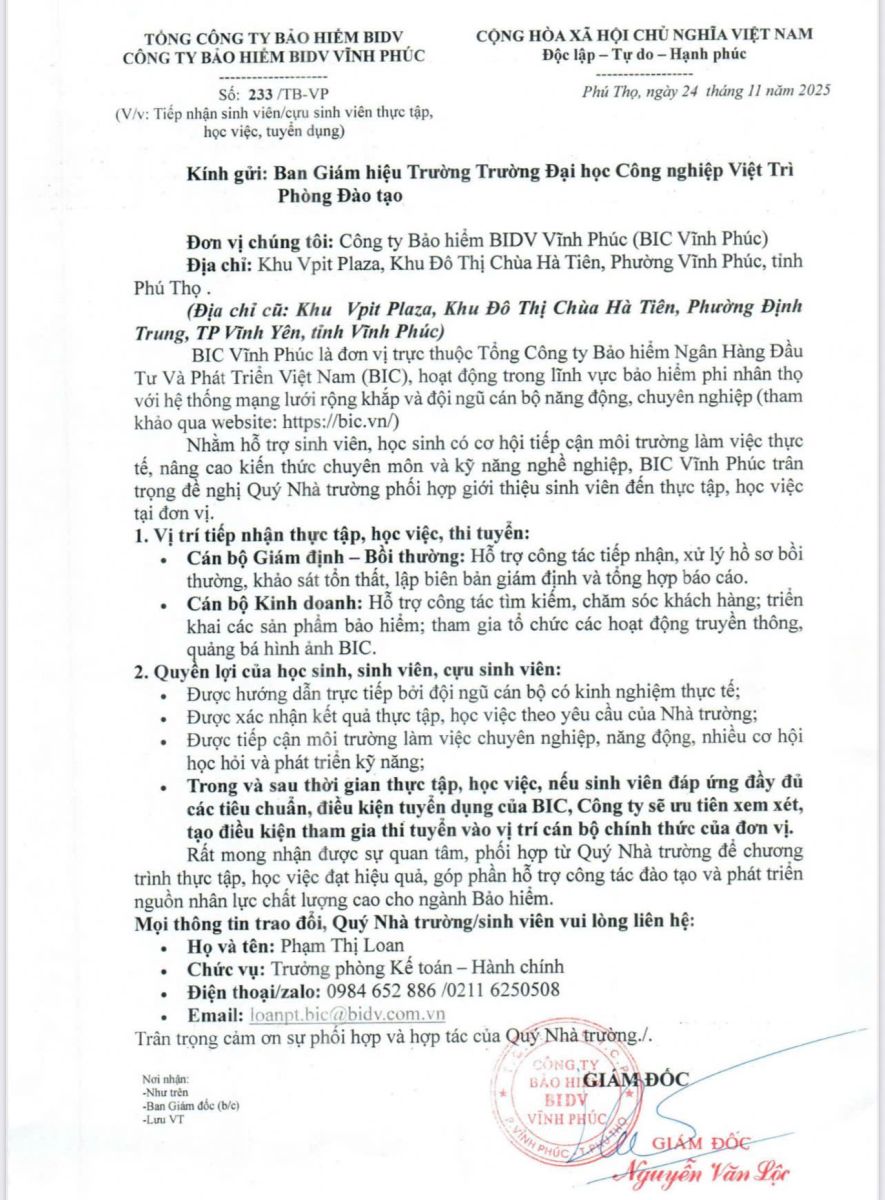 Công ty Bảo hiểm BIDV Vĩnh Phúc tuyển thực tập, học việc, tuyển dụng