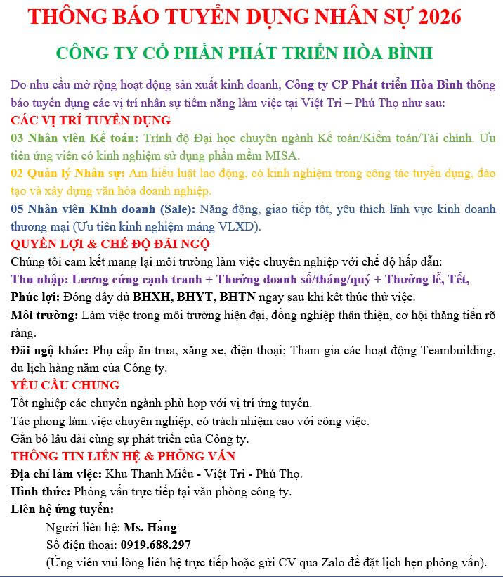 Nhằm đáp ứng nhu cầu mở rộng hoạt động sản xuất kinh doanh, Công ty CP Phát triển Hòa Bình tuyển dụng nhân sự làm việc tại Việt Trì – Phú Thọ như sau: