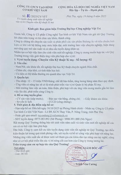 CÔNG TY CPCN TẠO HÌNH CƠ KHÍ VIỆT NAM TUYỂN DỤNG