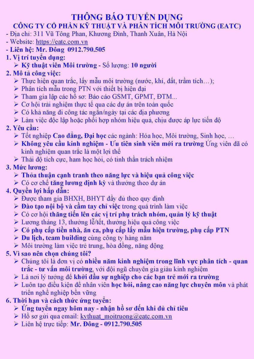 Công ty cổ phần Kỹ thuật và phân tích Môi trường (EATC) tuyển dụng Kỹ thuật viên Môi trường.