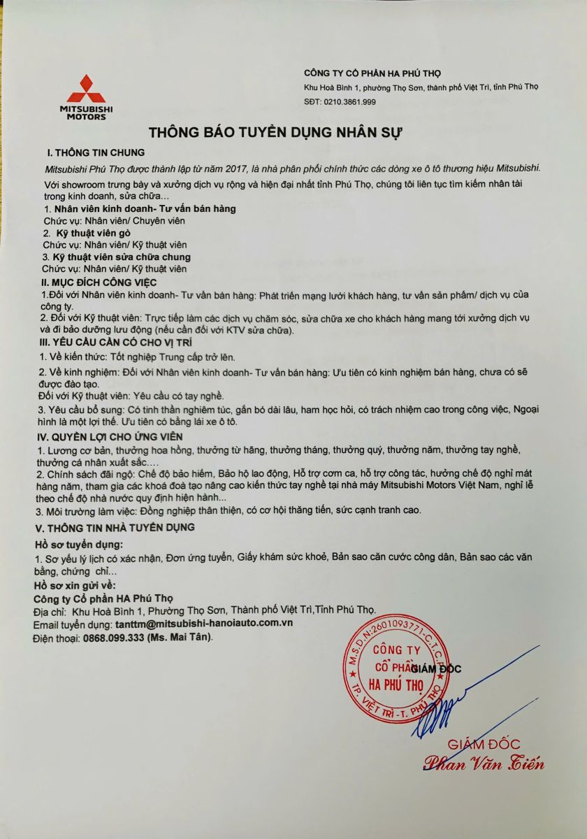 Thông báo tuyển dụng - Công ty Cổ phần HA Phú Thọ