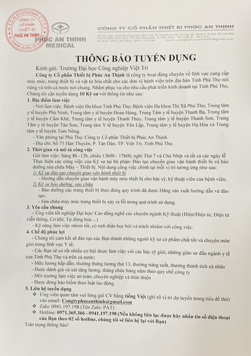 Tuyển dụng - Công ty cổ phần thiết bị Phúc An Thịnh
