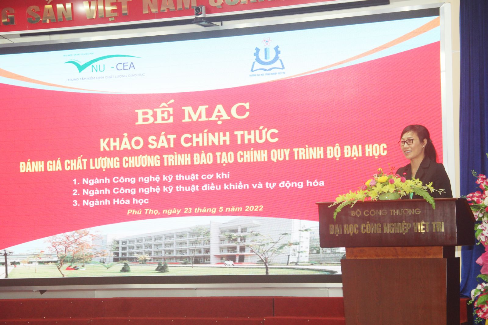 Phát biểu tại phiên bế mạc, TS. Tạ Thị Thu Hiền - Giám đốc Trung tâm KĐCLGD - ĐHQGHN ghi nhận và đánh giá cao các quy trình, phương pháp đánh giá khoa học, tinh thần làm việc trách nhiệm, khách quan, công tâm của Đoàn chuyên gia đánh giá ngoài trong quá trình nghiên cứu hồ sơ minh chứng, khảo sát sơ bộ và khảo sát chính thức để đưa ra những nhận định, đánh giá và khuyến nghị cải tiến chất lượng đối với Trường Đại học Công nghiệp Việt Trì. Đồng thời, cảm ơn sự phối hợp của Nhà trường và các Khoa, các đơn vị trong việc cung cấp các thông tin, minh chứng góp phần quan trọng cho thành công của đợt khảo sát. TS. Tạ Thị Thu Hiền cũng bày tỏ mong muốn tiếp tục thúc đẩy quan hệ hợp tác hiệu quả giữa hai bên trong lĩnh vực kiểm định chất lượng trong thời gian tới, góp phần đưa Trường Đại học Công nghiệp Việt Trì phát triển hơn nữa.