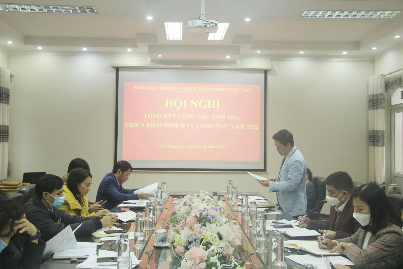 Đồng chí Vũ Đức Bình – Thường vụ Đảng ủy trình bày Báo cáo công tác kiểm tra, giám sát của Đảng ủy năm 2021, phương hướng, nhiệm vụ năm 2022; Báo cáo kết quả kiểm điểm, đánh giá xếp loại chất lượng đối với tổ chức đảng, đảng viên và tập thể, cá nhân cán bộ lãnh đạo, quản lý năm 2021.