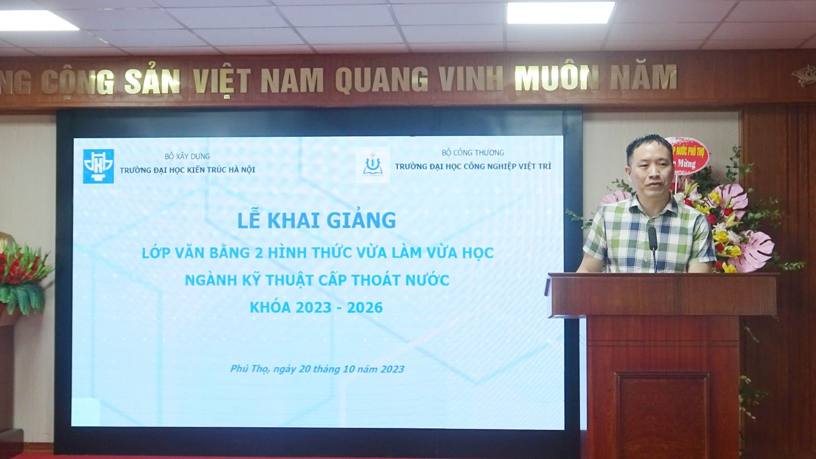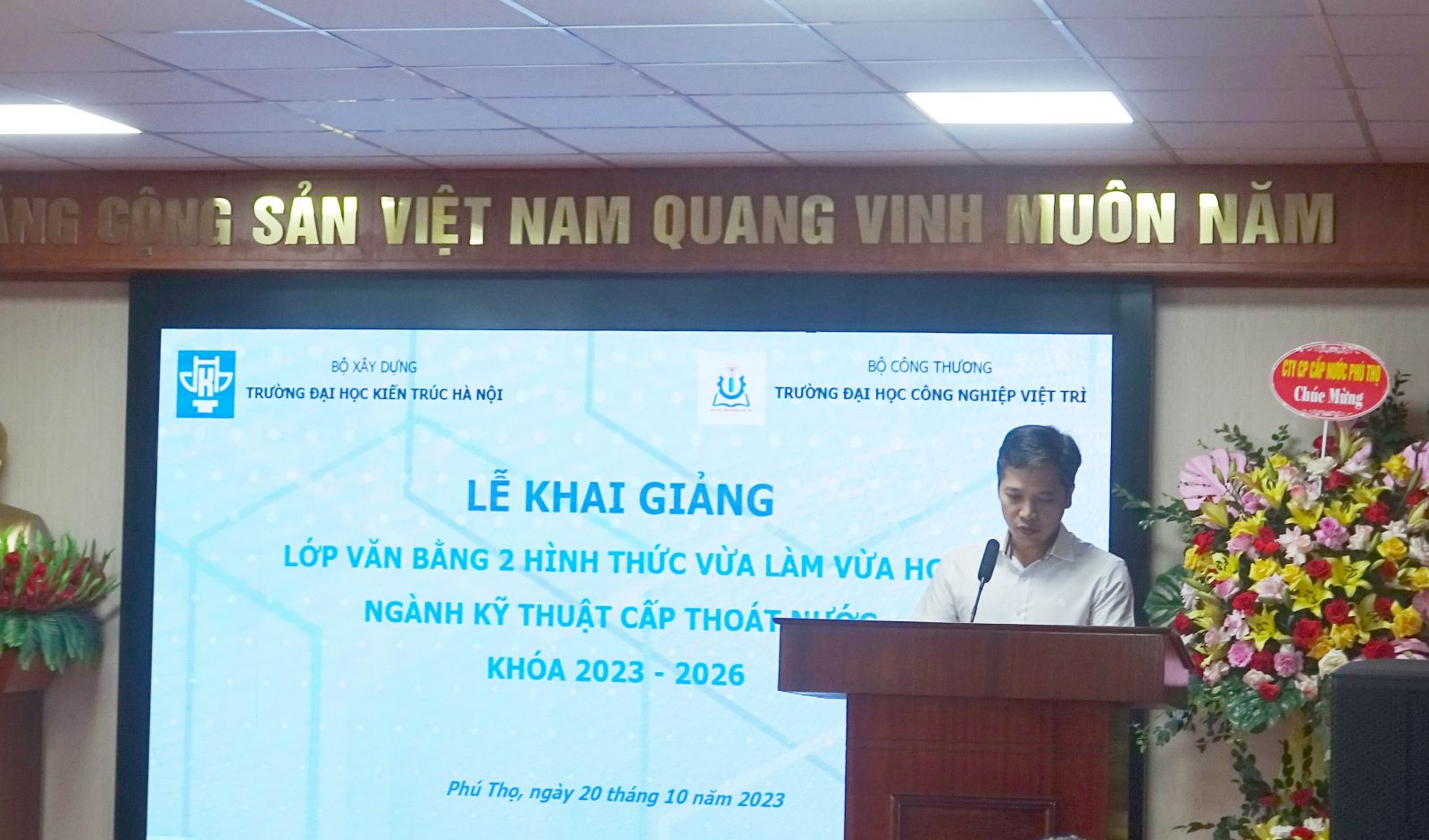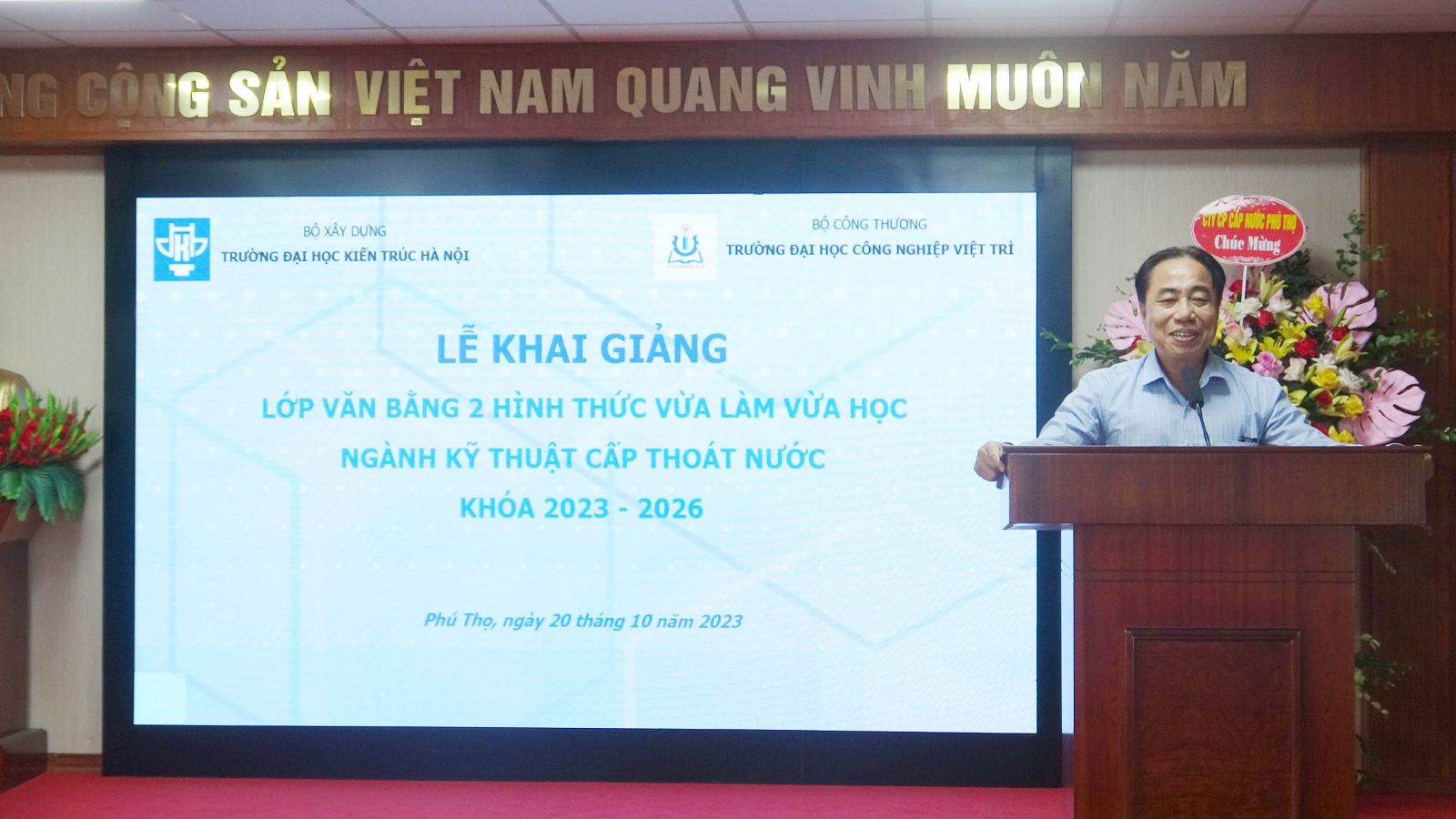 Thực hiện chủ trương của Nhà nước về hợp tác trong lĩnh vực giáo dục, đào tạo. Được sự nhất trí của lãnh đạo Trường Đại học Kiến trúc Hà Nội và Trường Đại học Công nghiệp Việt Trì. Sáng ngày 20/10/2023, tại hội trường cơ sở Việt Trì, Trường Đại học Kiến trúc Hà Nội phối hợp với Trường Đại học Công nghiệp Việt Trì đã long trọng tổ chức khai giảng lớp văn bằng 2 đại học hình thức vừa làm vừa học ngành Kỹ thuật cấp thoát nước khóa học 2023 – 2026.