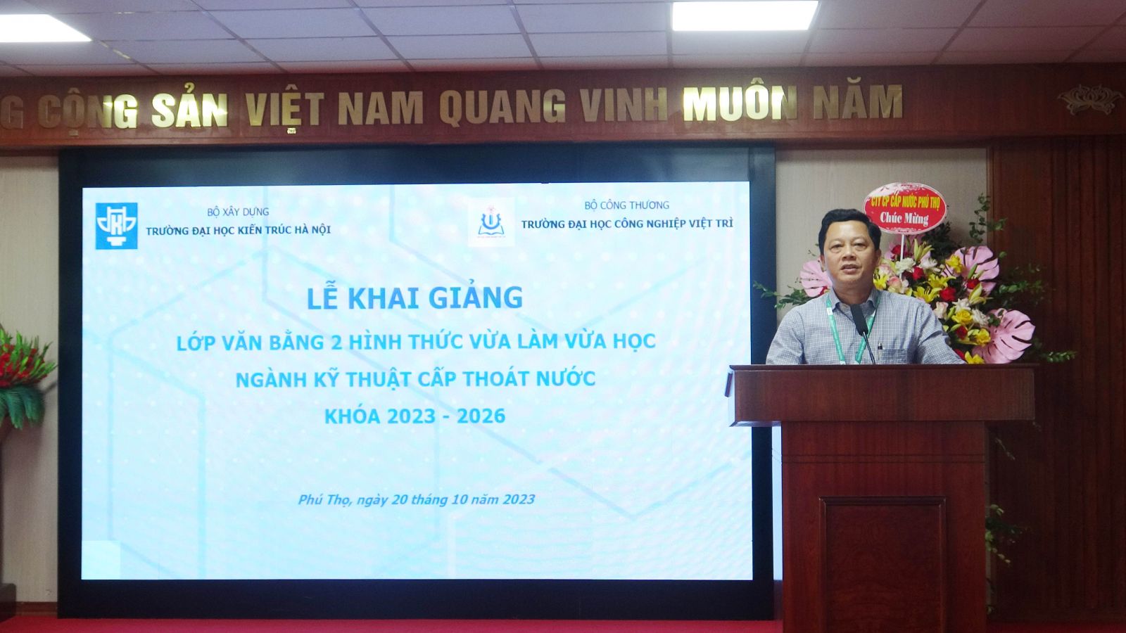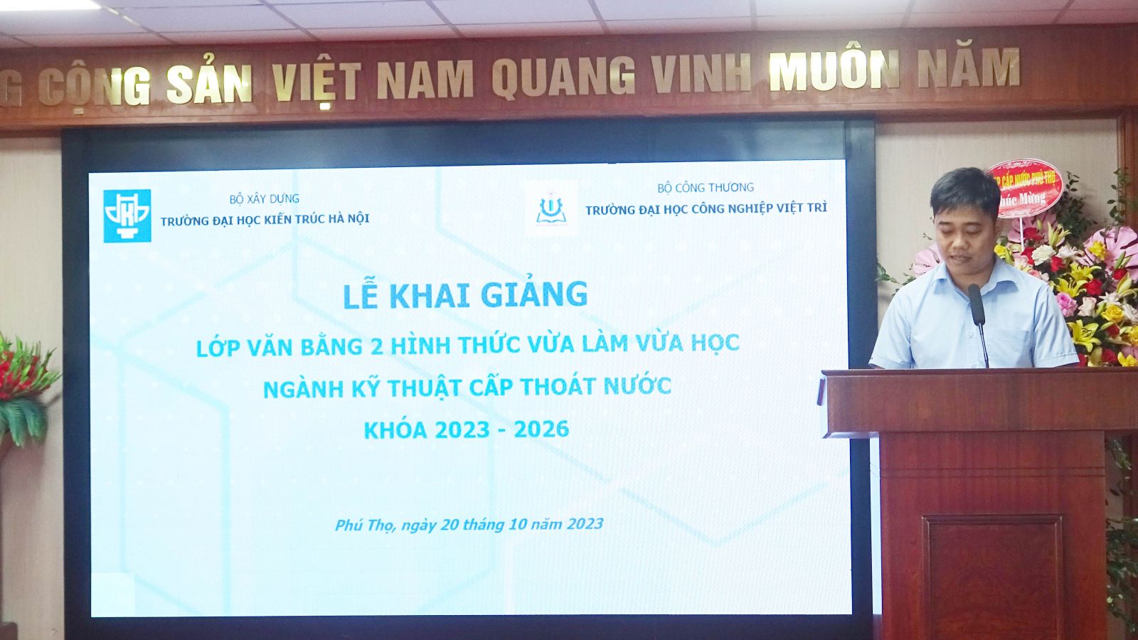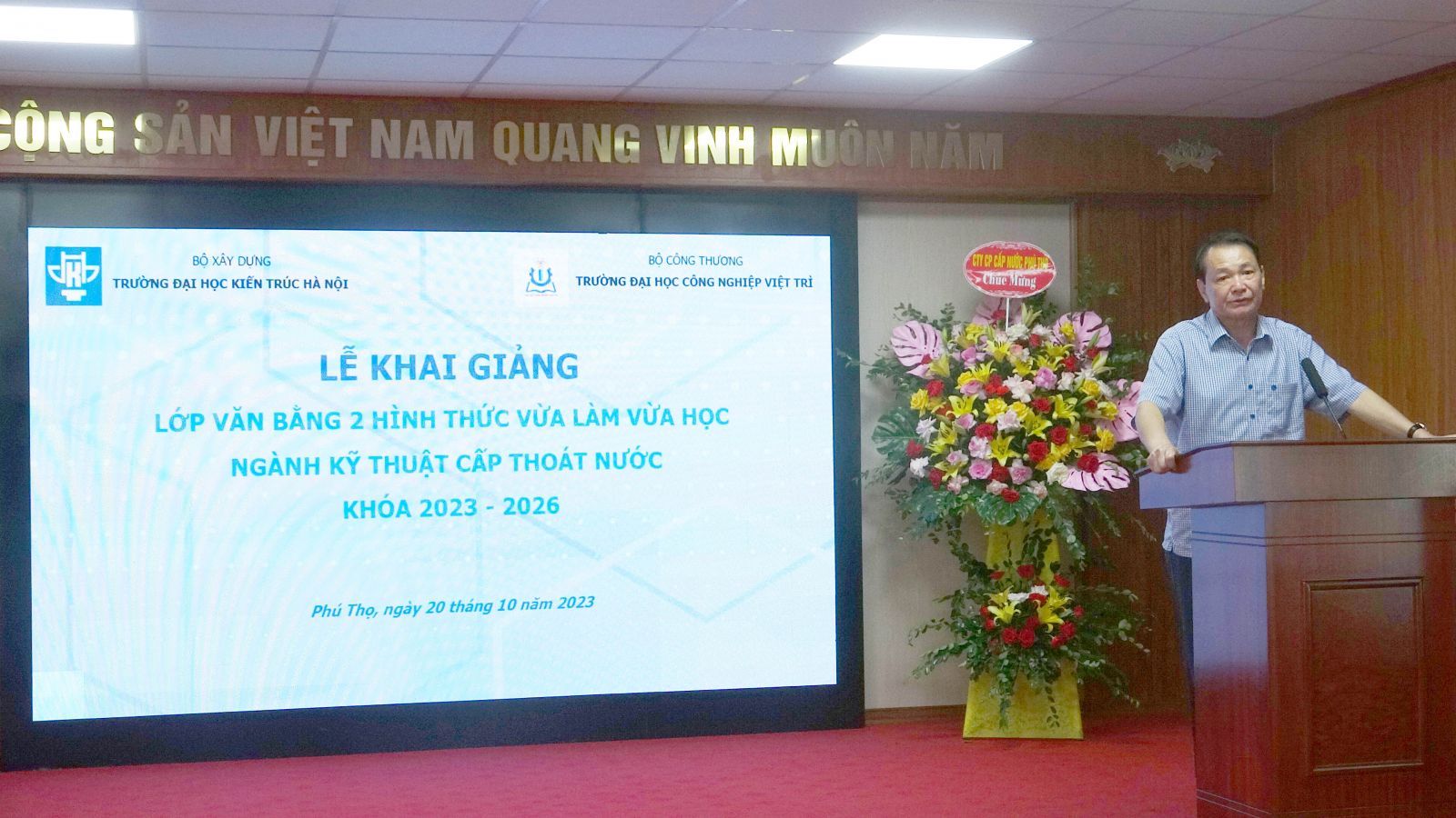 Thực hiện chủ trương của Nhà nước về hợp tác trong lĩnh vực giáo dục, đào tạo. Được sự nhất trí của lãnh đạo Trường Đại học Kiến trúc Hà Nội và Trường Đại học Công nghiệp Việt Trì. Sáng ngày 20/10/2023, tại hội trường cơ sở Việt Trì, Trường Đại học Kiến trúc Hà Nội phối hợp với Trường Đại học Công nghiệp Việt Trì đã long trọng tổ chức khai giảng lớp văn bằng 2 đại học hình thức vừa làm vừa học ngành Kỹ thuật cấp thoát nước khóa học 2023 – 2026.