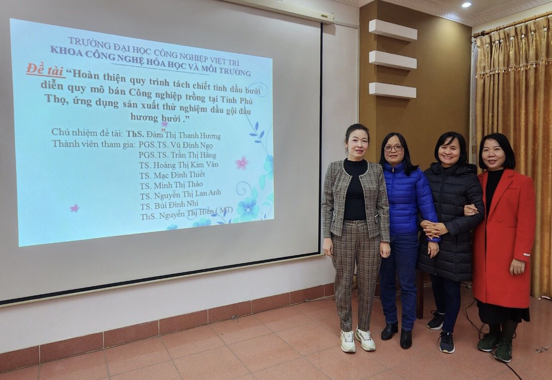 Sáng ngày 21/12/2022, tại phòng 305, giảng đường C1, Th.S Đàm Thị Thanh Hương đã bảo vệ thành công đề tài nghiên cứu khoa học: “Hoàn thiện quy trình tách triết tinh dầu bưởi diễn quy mô bán công nghiệp trồng tại tỉnh Phú Thọ, ứng dụng sản xuất thử nghiệm dầu gội đầu hương bưởi.