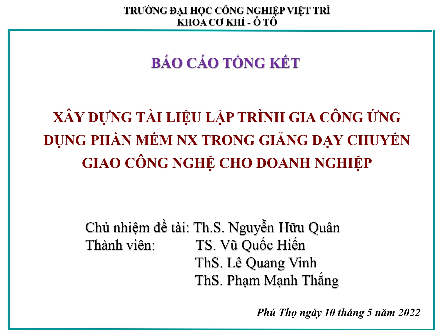 Chiều ngày 10/5/2022, tại phòng CAD/CAM/CNC, Th.S Nguyễn Hữu Quân bảo vệ thành công đề tài nghiên cứu khoa học: “Xây dựng bộ tài liệu lập trình gia công ứng dụng phần mềm NX trong giảng dạy chuyển giao công nghệ cho doanh nghiệp”.