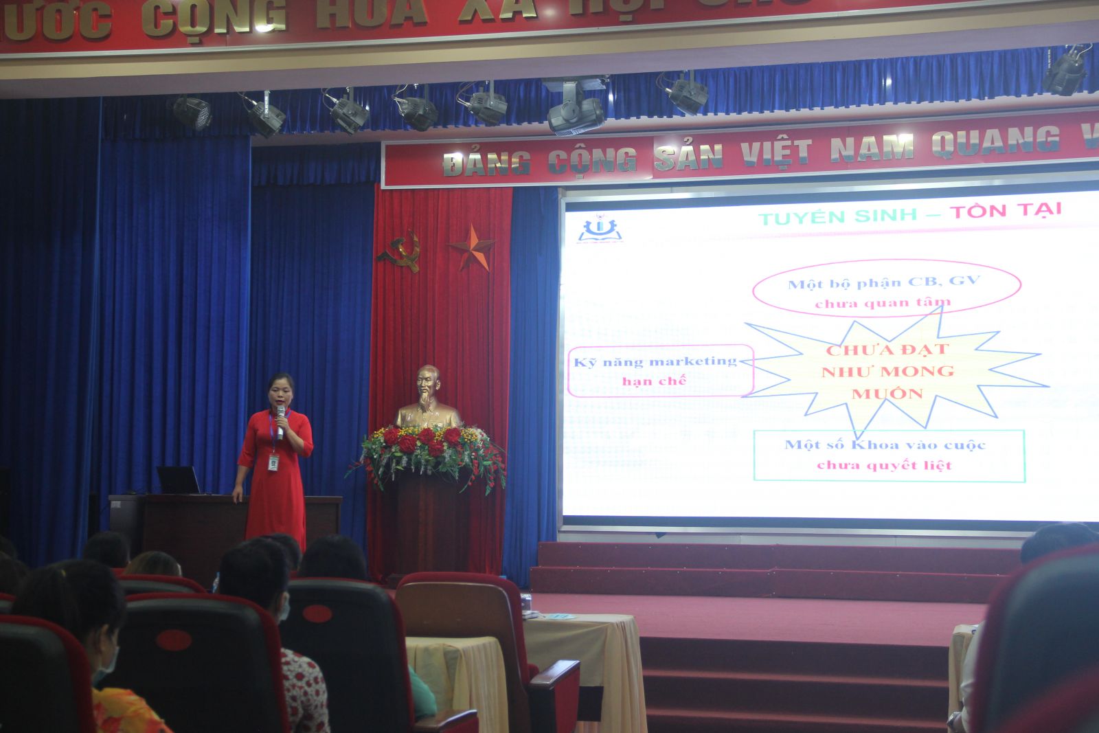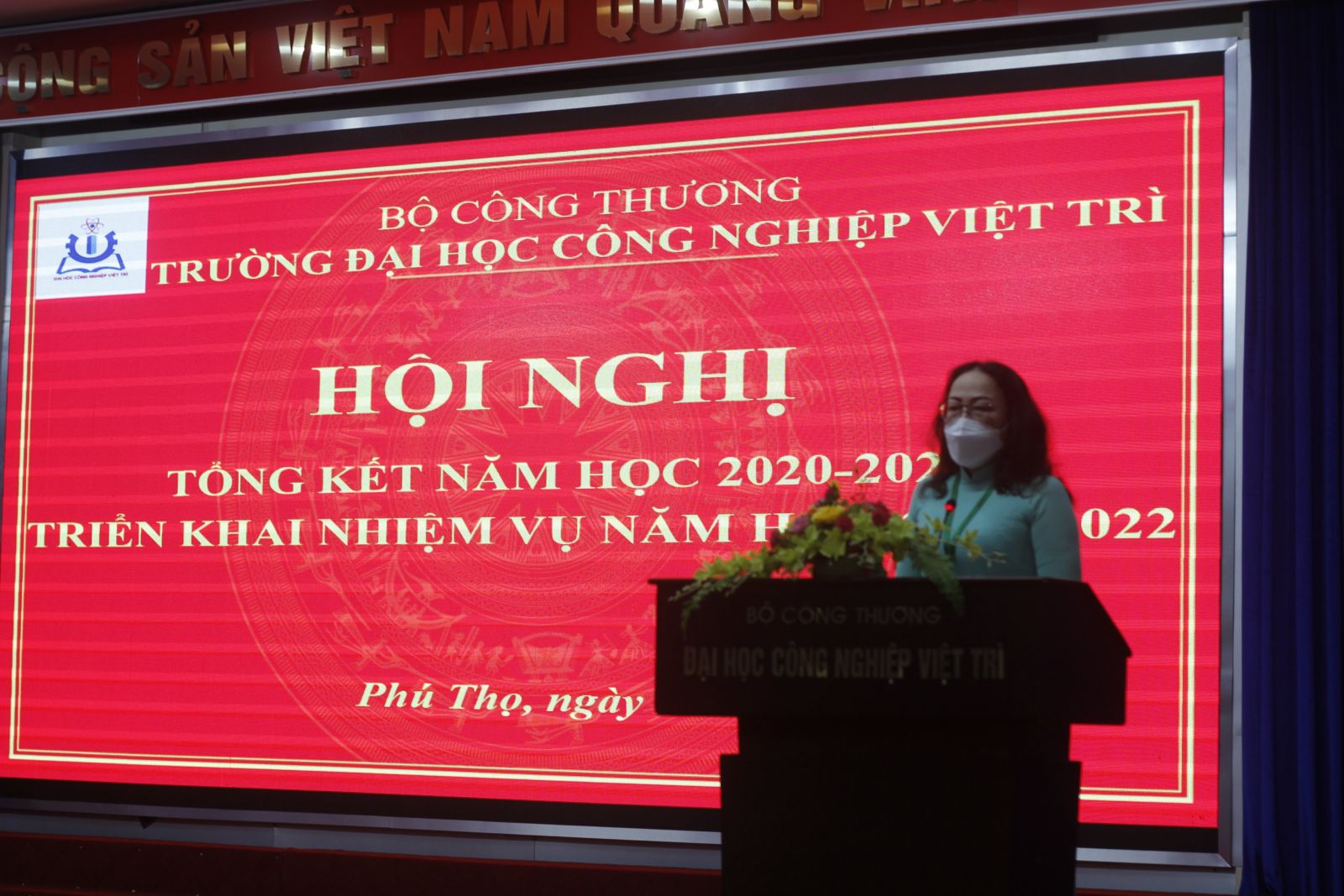 Mở đầu Hội nghị, PGS.TS. Trần Thị Hằng – Đảng uỷ viên, Phó Hiệu trưởng nhà trường đã thay mặt lãnh đạo nhà trường trình bày báo cáo tổng kết năm học 2020-2021 và phương hướng nhiệm vụ năm học 2021-2022. Nội dung báo cáo nhấn mạnh các vấn đề về: Công tác tổ chức cán bộ; Công tác tuyển sinh; Công tác đào tạo, khảo thí; Công tác sinh viên; Công tác nghiên cứu khoa học; Công tác đảm bảo chất lượng...