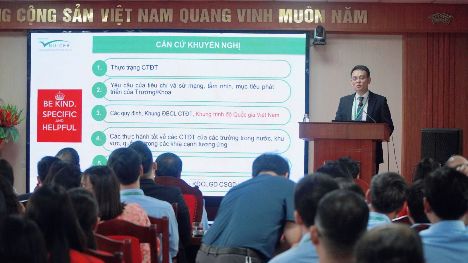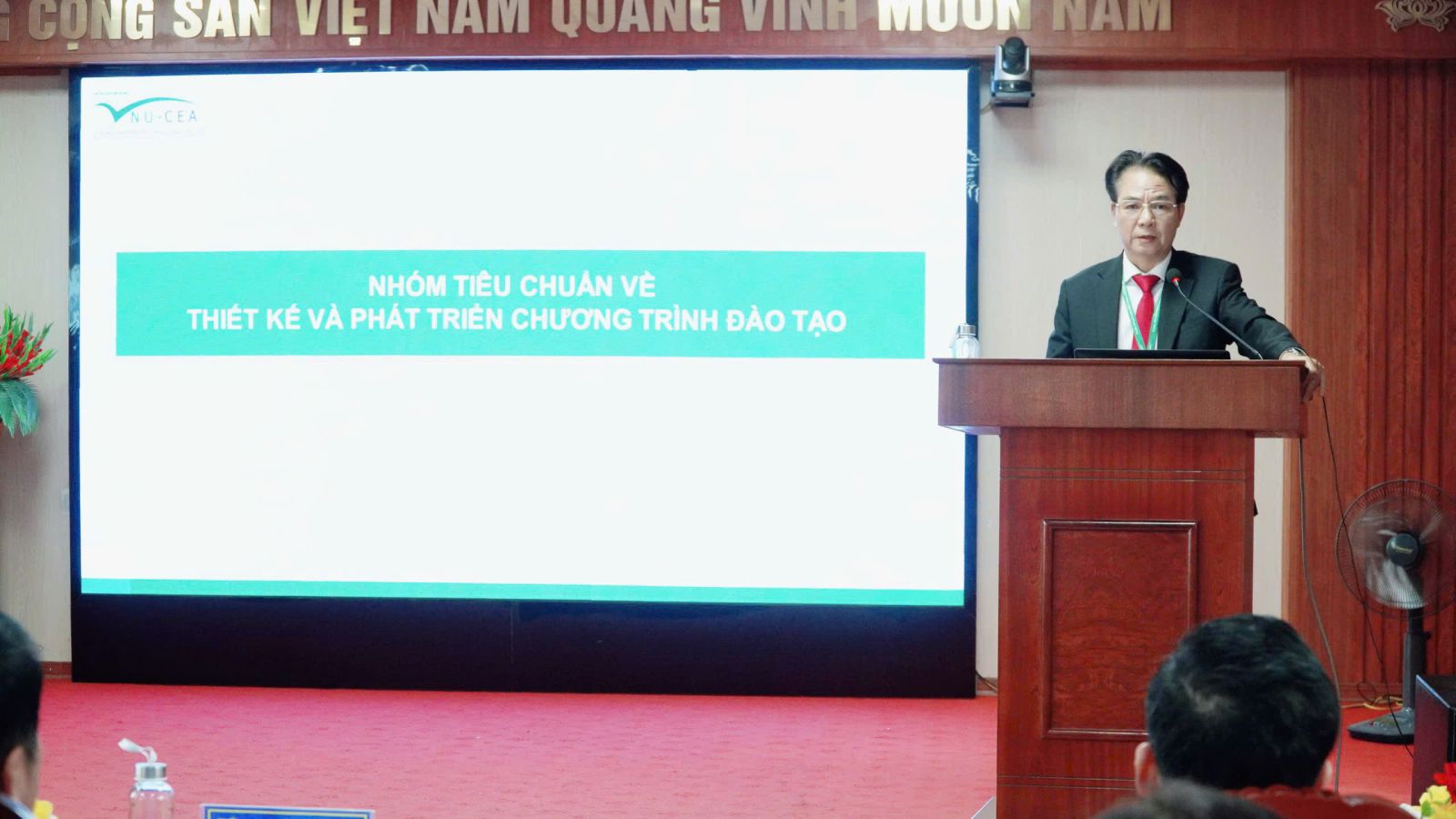 PGS.TS. Nguyễn Văn Long - Nguyên Chủ tịch Hội đồng trường, Trường Đại học Giao thông vận tải – Thành viên đoàn đánh giá ngoài trình bày nhóm tiêu chuẩn về thiết kế và phát triển chương trình đào tạo.