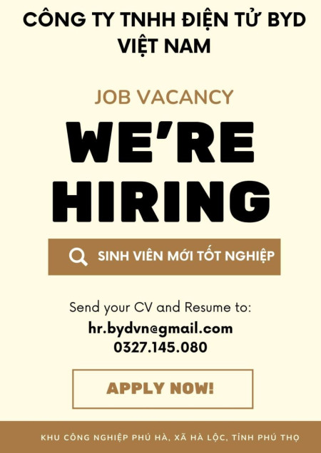 CÔNG TY TNHH ĐIỆN TỬ BYD VIỆT NAM TUYỂN DỤNG
