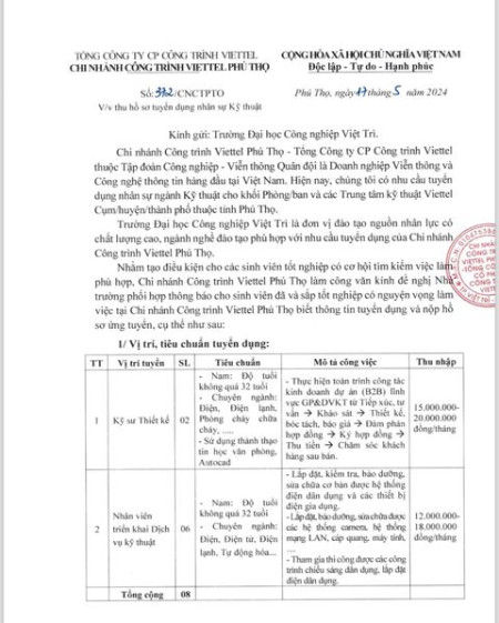 Thông báo tuyển dụng _ Tổng công ty CP công trình Viettel chi nhánh công trình Viettel Phú Thọ