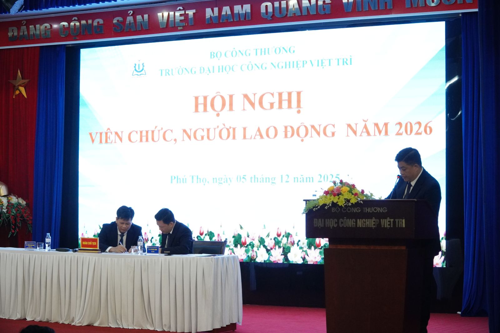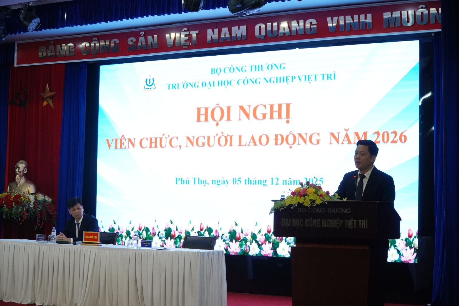 Phát biểu kết luận Hội nghị, TS. Vũ Đức Bình - Hiệu trưởng Nhà trường đã nhấn mạnh một số công tác cần triển khai trong thời gian tới: Tiếp tục phát huy và quyết tâm thực hiện thắng lợi các nhiệm vụ năm 2026, chú trọng các giải pháp nhằm nâng cao chất lượng đào tạo; Chú trọng công tác tuyển sinh; Duy trì kỷ luật, kỷ cương nhà trường, đẩy mạnh công tác thanh tra, kiểm tra và quan tâm đến công tác hỗ trợ sinh viên; Tập trung vào công tác đào tạo, bồi dưỡng và nghiên cứu khoa học; Có giải pháp nâng cao thu nhập cho cán bộ, viên chức yên tâm công tác; Tạo môi trường làm việc tốt, dân chủ… Thầy gửi lời chúc mạnh khỏe, hạnh phúc đến toàn thể Hội nghị và chúc Trường Đại học Công nghiệp Việt Trì bước vào giai đoạn tự chủ nhiều khởi sắc.
